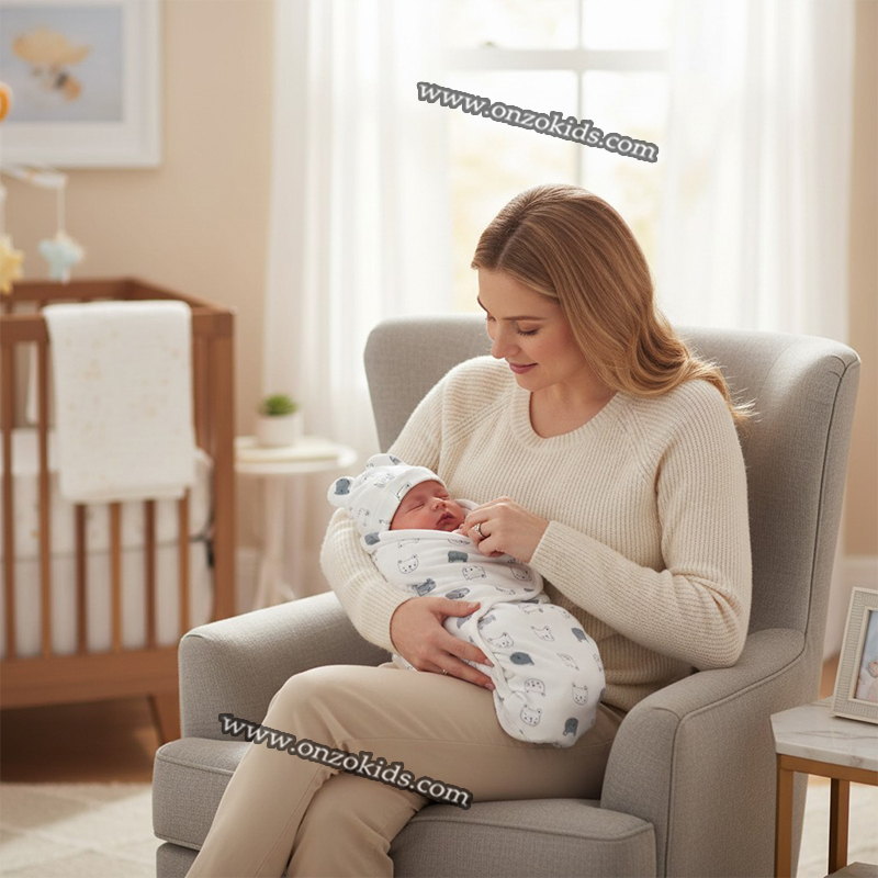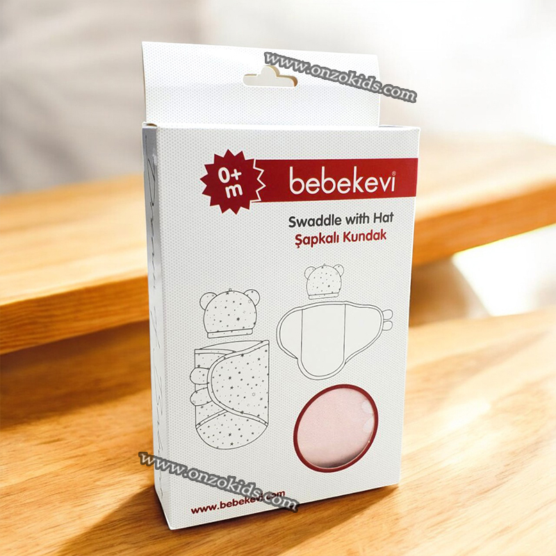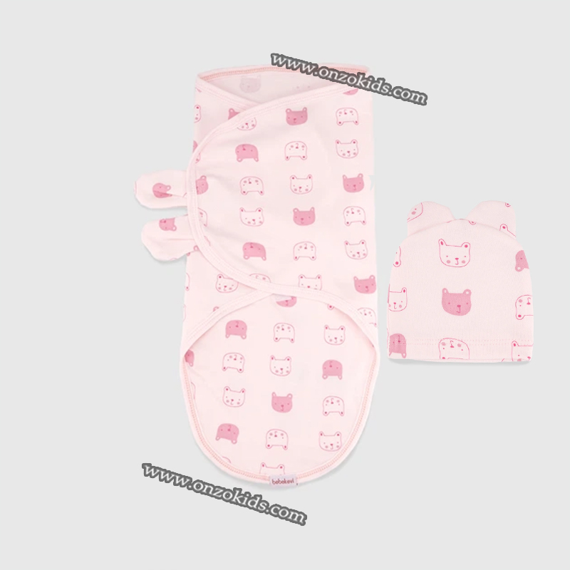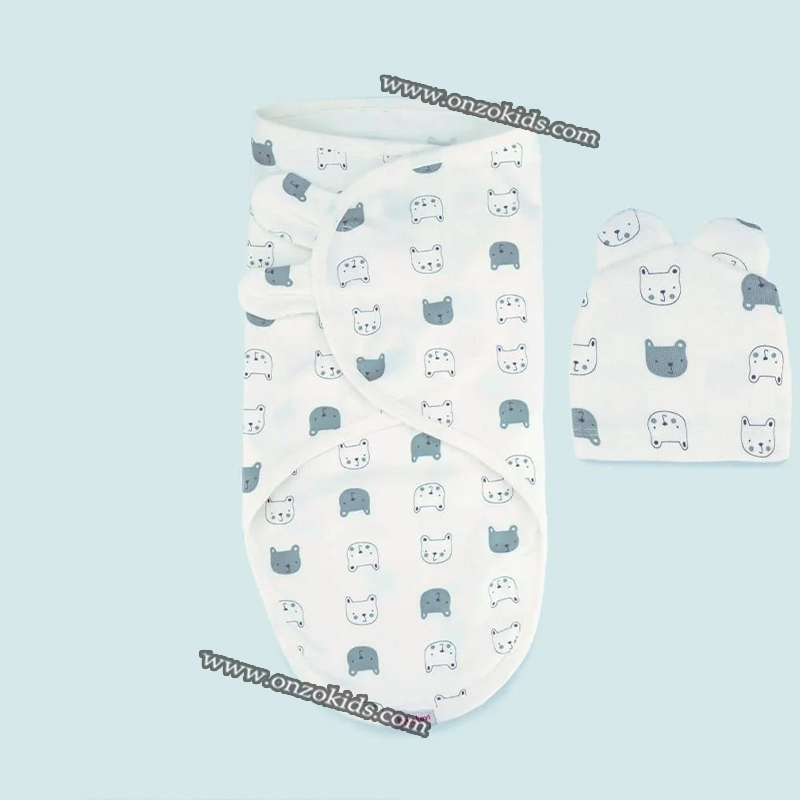 Couverture d’emmaillotage avec bonnet – Bebekevi, pour envelopper doucement bébé et prévenir les mouvements des bras souvent à l’origine de réveils.