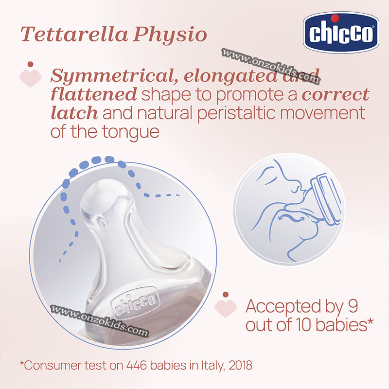 Grâce à la tétine Physio spéciale en silicone doux avec finition Soft Sense, le biberon Chicco PERFECT EASY garantit une succion naturelle et agréable.