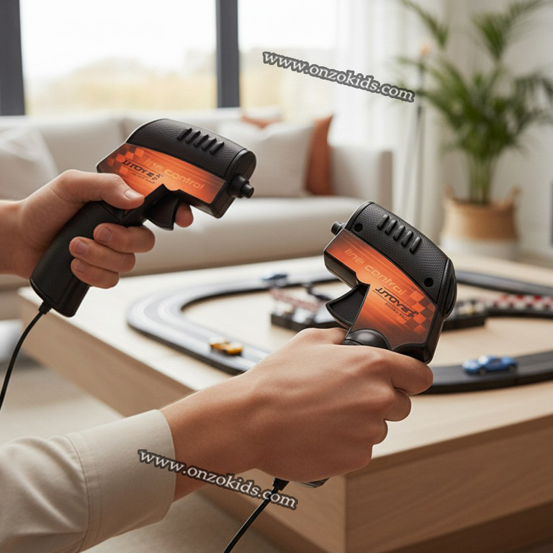 Le jeu comprend deux voitures de course et deux manettes filaires, fonctionnant grâce à un adaptateur électrique et reliées à la piste par des câbles.