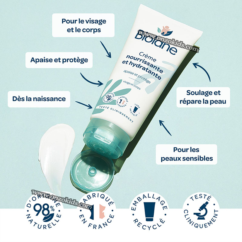 La crème nourrissante et hydratante Biolane hydrate durablement et apporte souplesse et confort à la peau de votre bébé.