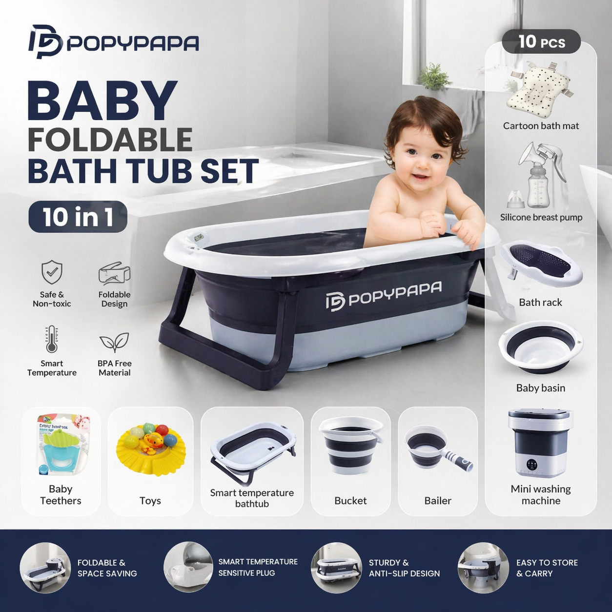 ENSEMBLE BÉBÉ 10 EN 1 : Solution de bain complète comprenant une baignoire pliable, un thermomètre, un gobelet de rinçage, un bouchon de vidange et de nombreux mini-accessoires de bain lavables en machine pour prendre soin de bébé.