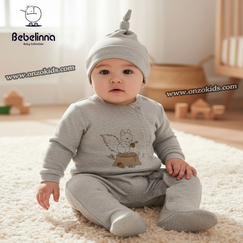 Son joli motif écureuil apporte une touche tendre et ludique, tandis que le bonnet assorti complète parfaitement la tenue. Idéal pour la maison, la sieste ou les premières sorties.