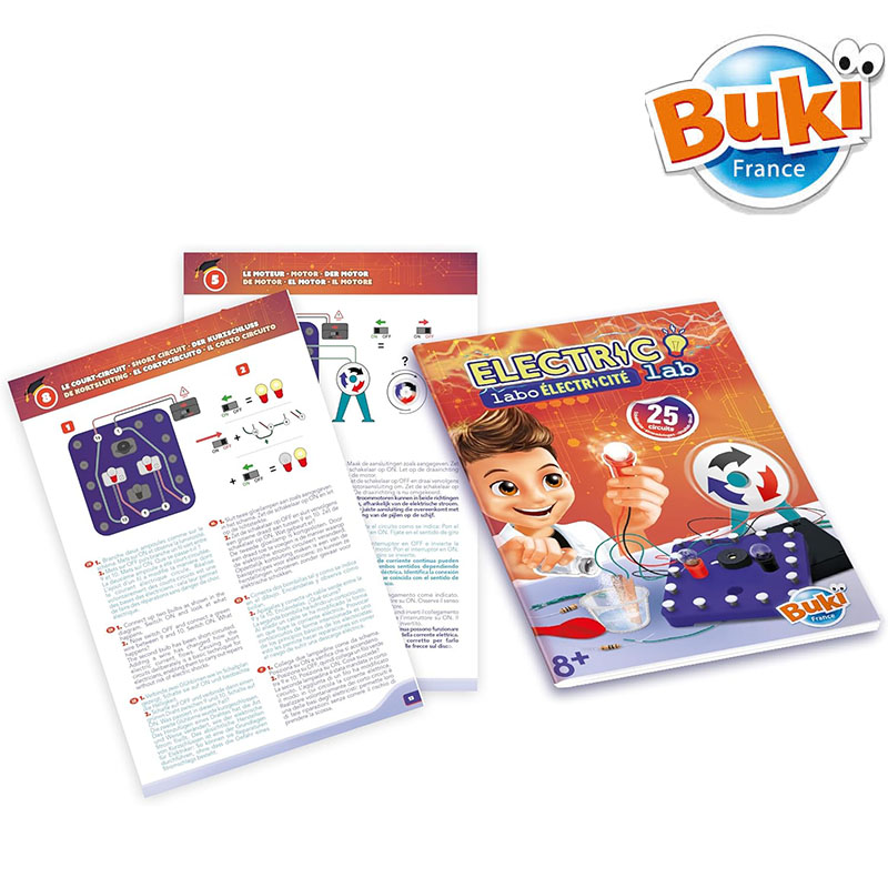 Contenu : instructions illustrées en couleur avec photos et schémas faciles à suivre. Contient divers composants : ampoules, buzzers, moteur, résistances…