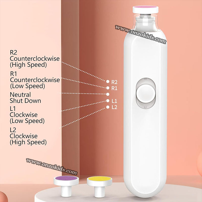 Différents disques colorés selon l’âge et le type d’ongles : Nouveau-né, Bébé, Enfant, Adulte, Polissage doux Chaque embout est conçu pour ne pas blesser la peau.