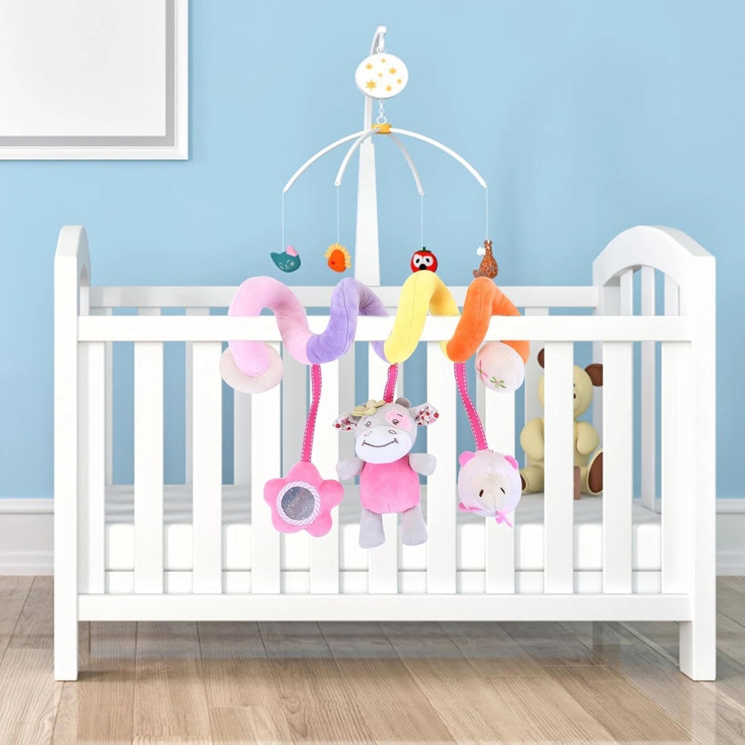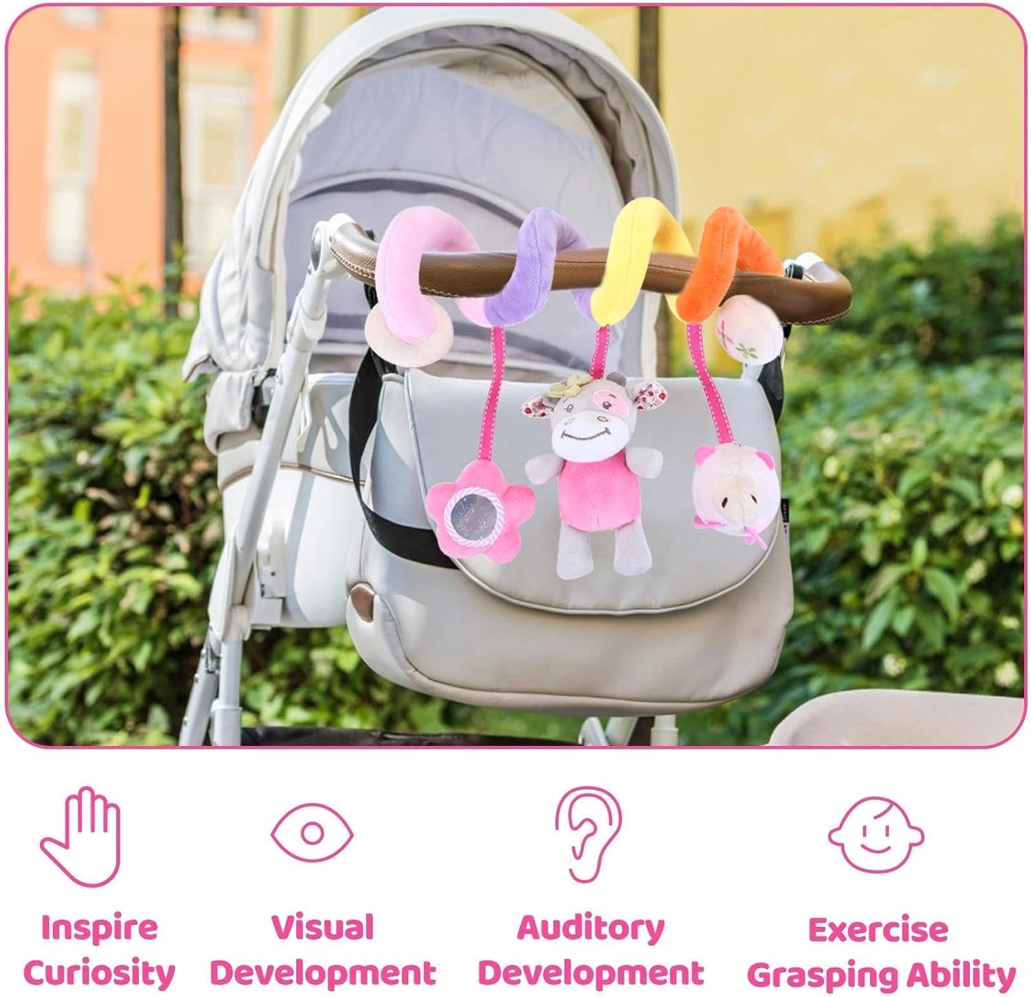 Structure spirale flexible, Permet d’enrouler facilement le jouet autour :de la poussette, du siège-auto, du lit bébé, du parc et de la barre de jeu