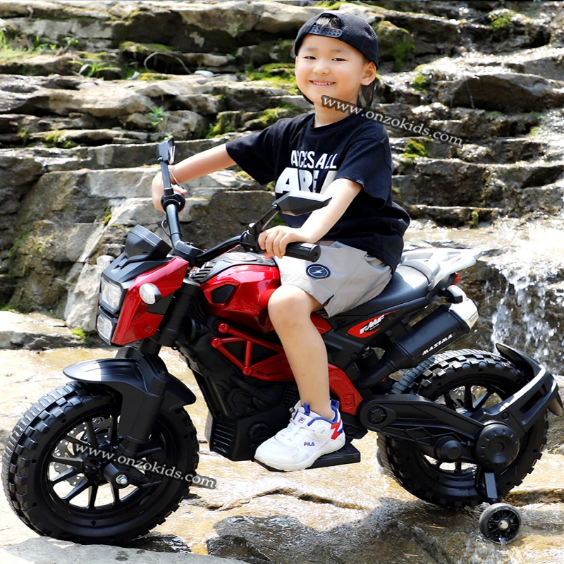 Moto électrique pour enfants, style moto cross/adventure. Elle est conçue pour ressembler à une vraie moto, avec un look sportif et moderne.