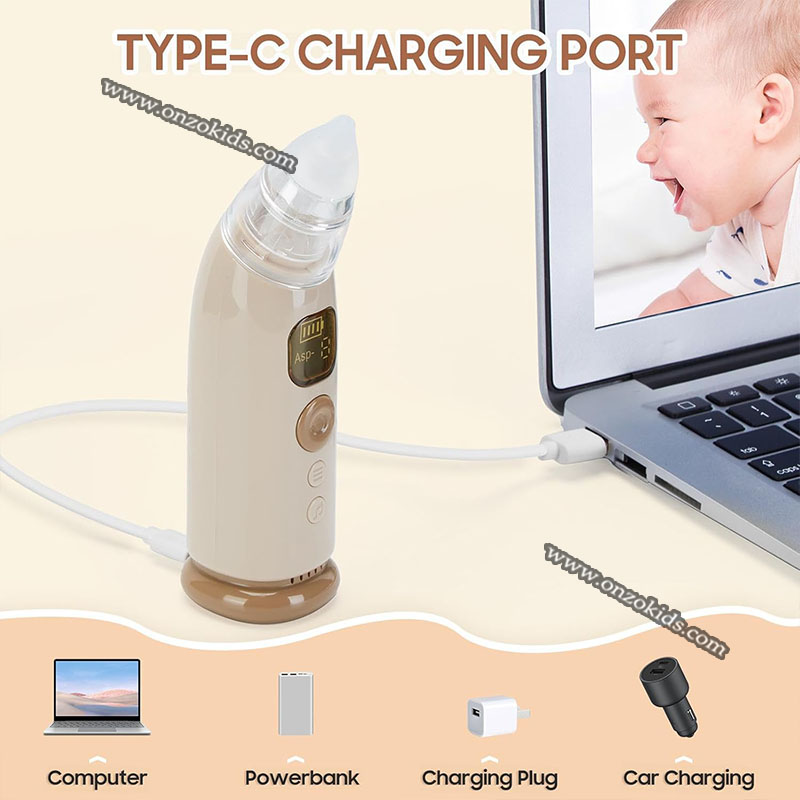 Aspirateur Nasal Mouche Bébé Électrique batterie au lithium rechargeable intégrée. Il est rechargeable et portable. La batterie longue durée vous permet de l’utiliser quand vous en avez besoin, éliminant ainsi les tracas liés au remplacement de la batterie. Absolument sans danger pour votre bébé.
