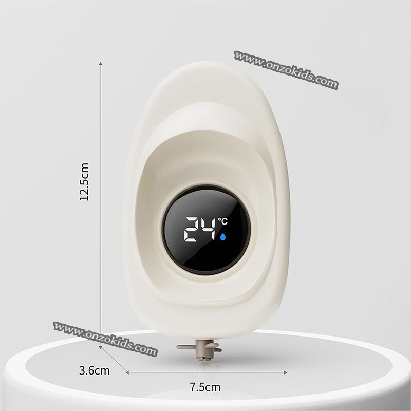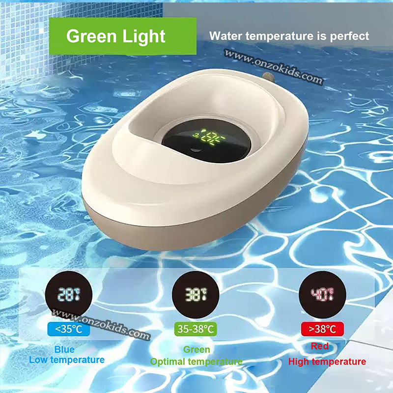 Système d’alerte de température à 3 couleurs : Bleu (moins de 35 °C) : L’eau est trop froide pour bébé. Vert (35 °C à 38 °C) : Température du bain idéale et sûre. Rouge (plus de 38 °C) : Attention L’eau est trop chaude pour la peau délicate de bébé.